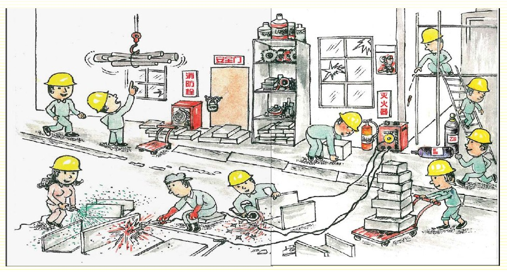 最后,劉群向大家展示了一張漫畫,在漫畫中識(shí)別身邊的違章。一張簡單的漫畫,卻存在40多處安全隱患,例如電焊線交叉、高空拋物、施工通道被阻塞等等。