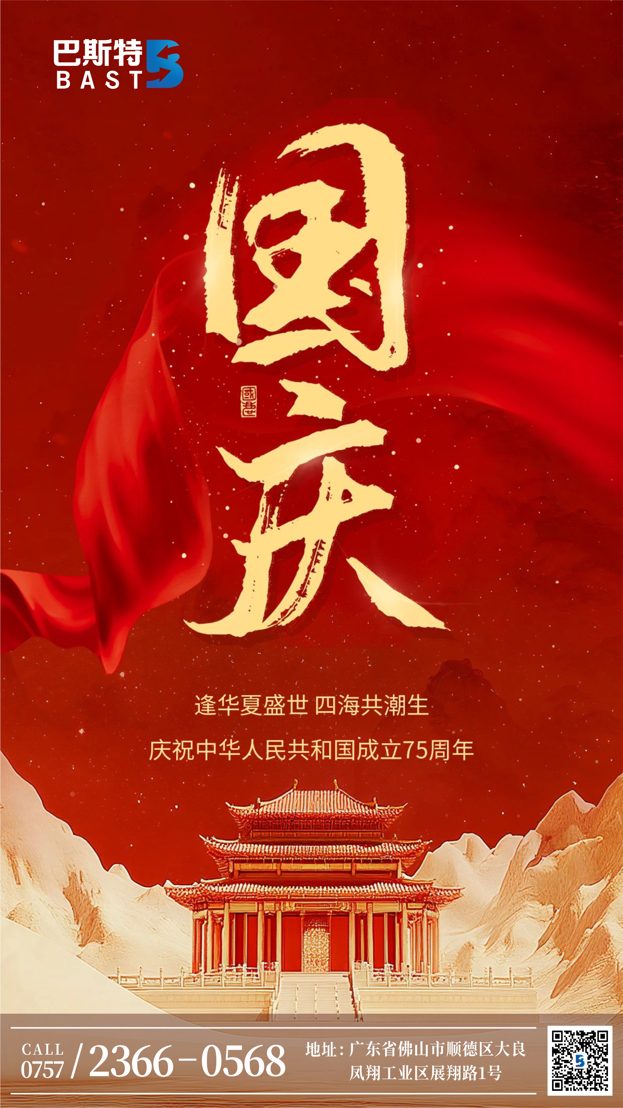 紅旗飄揚,國泰民安;盛世華誕,錦繡華章。在這金秋送爽、丹桂飄香的美好時節(jié),我們迎來了偉大祖國75周年的光輝節(jié)日。廣東巴斯特科技股份有限公司向祖國獻上最誠摯的祝福,向一直以來支持公司發(fā)展的廣大客戶、合作伙伴及辛勤工作的員工致以節(jié)日的問候和衷心的感謝!
